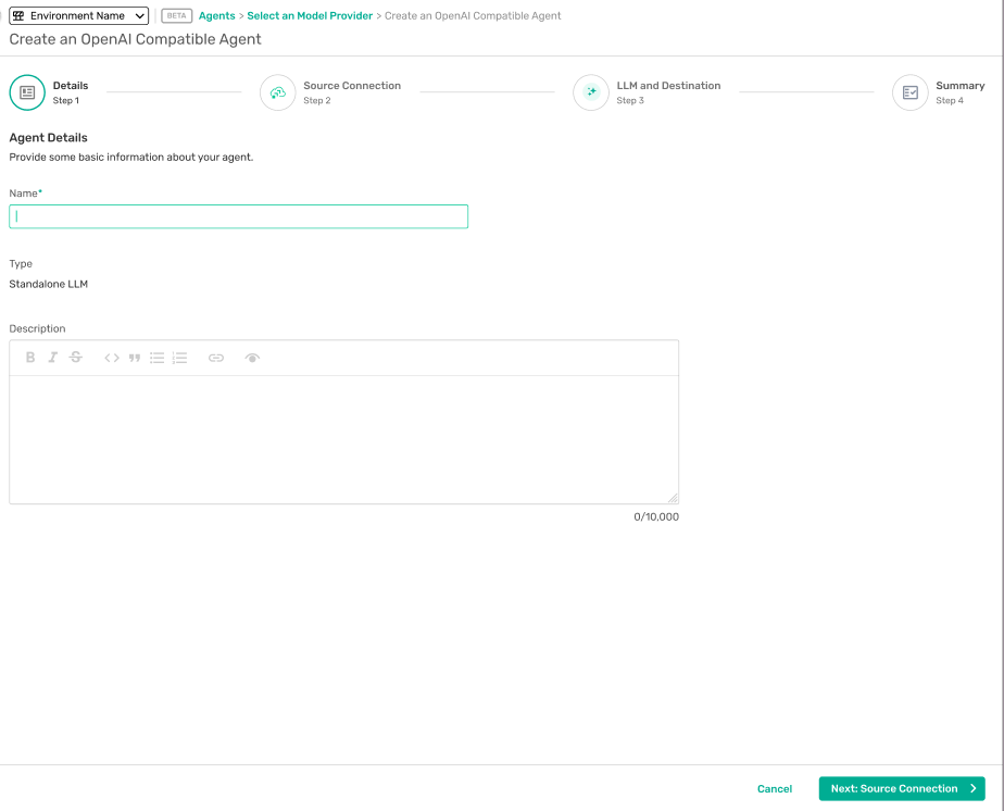 6. On the Details step, enter a unique name for your Agent. Optionally, add a description, and then click Next: Source Connection.