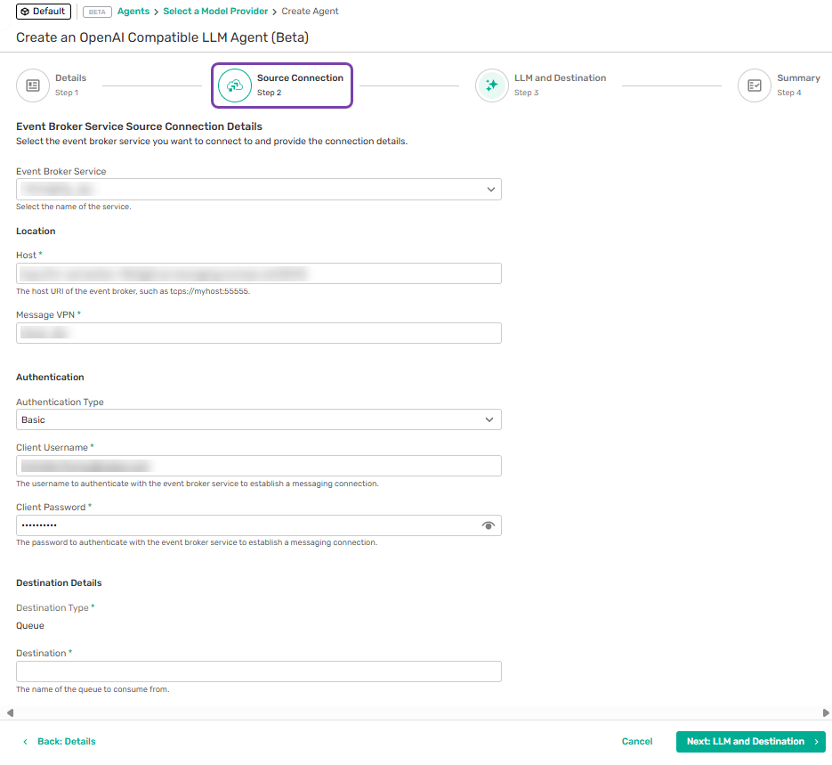 7. On the Source Connection step, enter the details for your event broker service. See Configuring Your Event Broker Service.