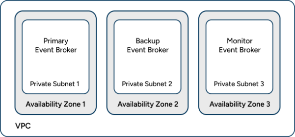Solace Cloud implements HA using an active/standby model with an arbiter node (monitoring node) for split-brain detection. This setup requires three event broker instances: