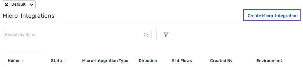 3. If your organization uses multiple environments, on the Micro-Integrations page, select the environment where you want to create the Micro-Integration. For more information, see Selecting Environments.