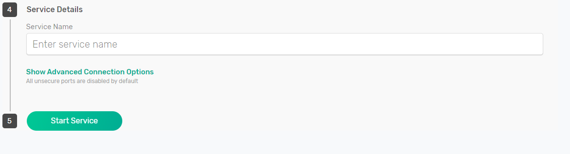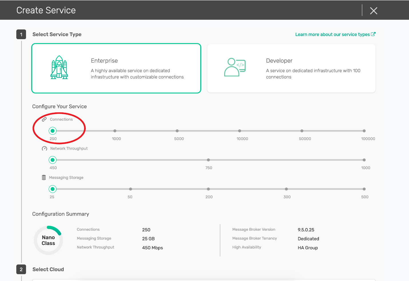 If your account is configured with the appropriate limits, you can start a 250-connection service just as you would with any of the other services, Upon service creation for enterprise services, you’ll notice the connection slider now starts at 250 and goes up to 100K.