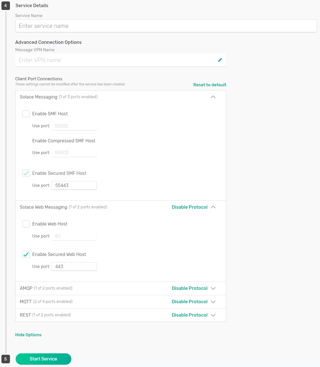 From there, you can enable or disable the secure (HTTPS) or unsecure (HTTP) ports for each of the supported messaging protocols (you can see secure ports are enabled by default). You can also use this screen during service creation to customize the messaging ports you use for enterprise and developer event broker services, giving you options if the default port is unavailable or another port is preferred.